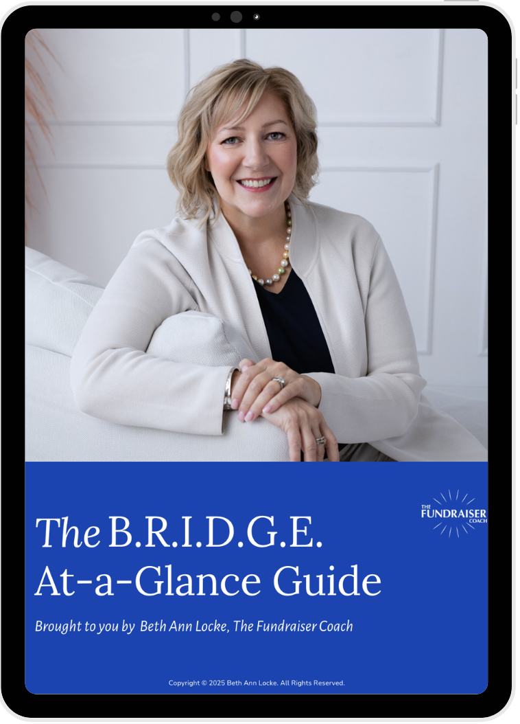 Beth Ann Locke spent 30+ years as an embedded fundraiser before transitioning to coaching fundraisers in her Connection-Based Approach. She's raised over $75 million for organizations ranging from universities to hospitals to international NGOs, in both the US and Canada.